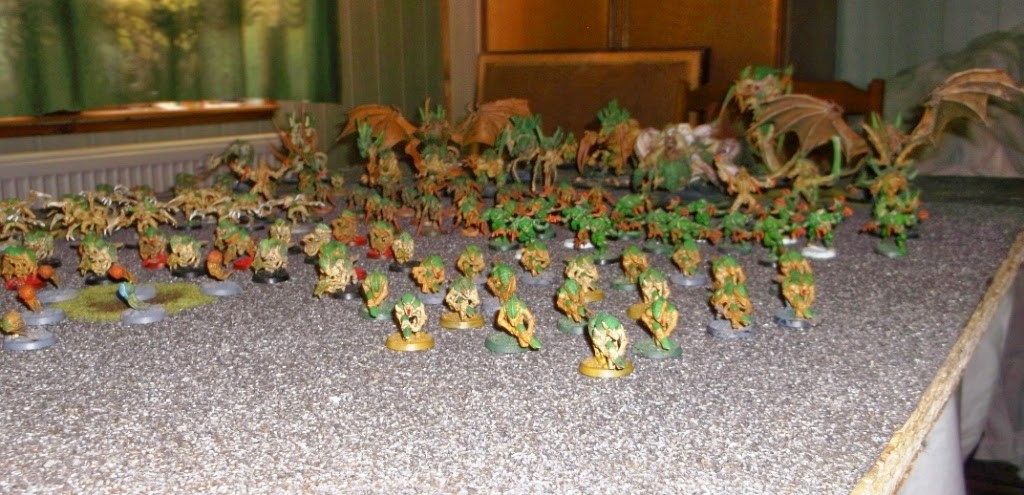 Powyżej zdjęcie całościowe pomalowanej części tej armii, w kartonach leżą jeszce pojedyńcze gaunty, w zbiornikach zarodniowych formuje się kolejny Mavlock, a na warsztacie malarskim jest Harpia/Cron, w zakamarkach szafy czają się roje Rozrywaczy.